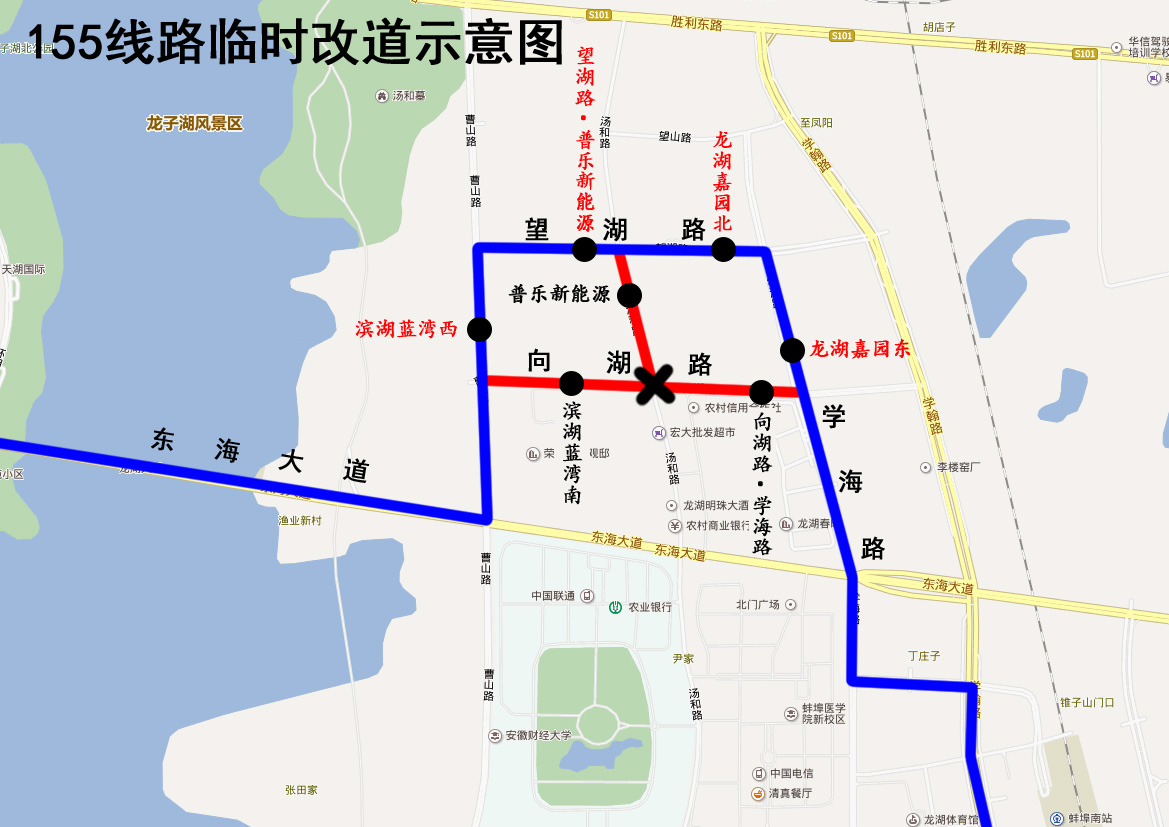 155路公交车临时改道公告 接上级通知,因汤和路与望湖路交叉口封闭施工结束,自5月21日起,公交155路来回双向改道为:原线路—东海大道—曹山路—望湖路—学海路—原线路。 改道期间,公交车将取消停靠“汤和北路•普乐新能源”、“滨湖蓝湾南”、“向湖路•学海路”站。临时停靠“滨湖蓝湾西”、“望湖路•普乐新能源”、“龙湖嘉园北”、“龙湖嘉园东”站。 封闭施工结束后恢复原线 。